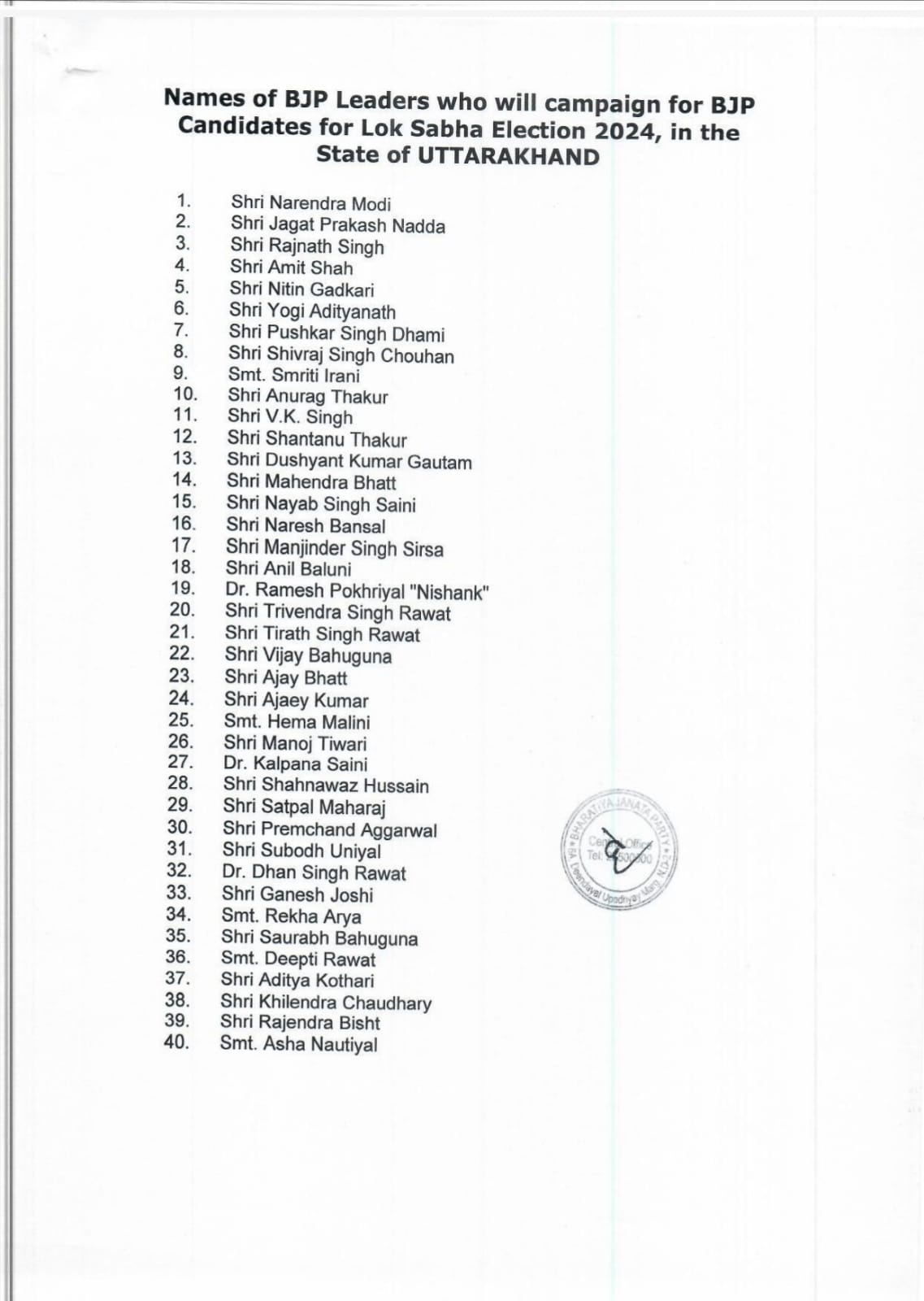 देहरादून। भाजपा ने लोक सभा चुनाव के लिए स्टार प्रचारकों की सूची जारी कर दी है। पार्टी के प्रदेश मीडिया प्रभारी मनवीर सिंह चौहान ने कहा कि प्रांतीय कमेटी के प्रस्ताव पर हाई कमान ने राज्य मे 40 स्टार प्रचारकों की सूची को अंतिम रूप दे दिया है।पीएम मोदी और राष्ट्रीय अध्यक्ष जे पी नड्ढा सहित कई वरिष्ठ नेता चुनावी जनसभा को संबोधित करेंगे।