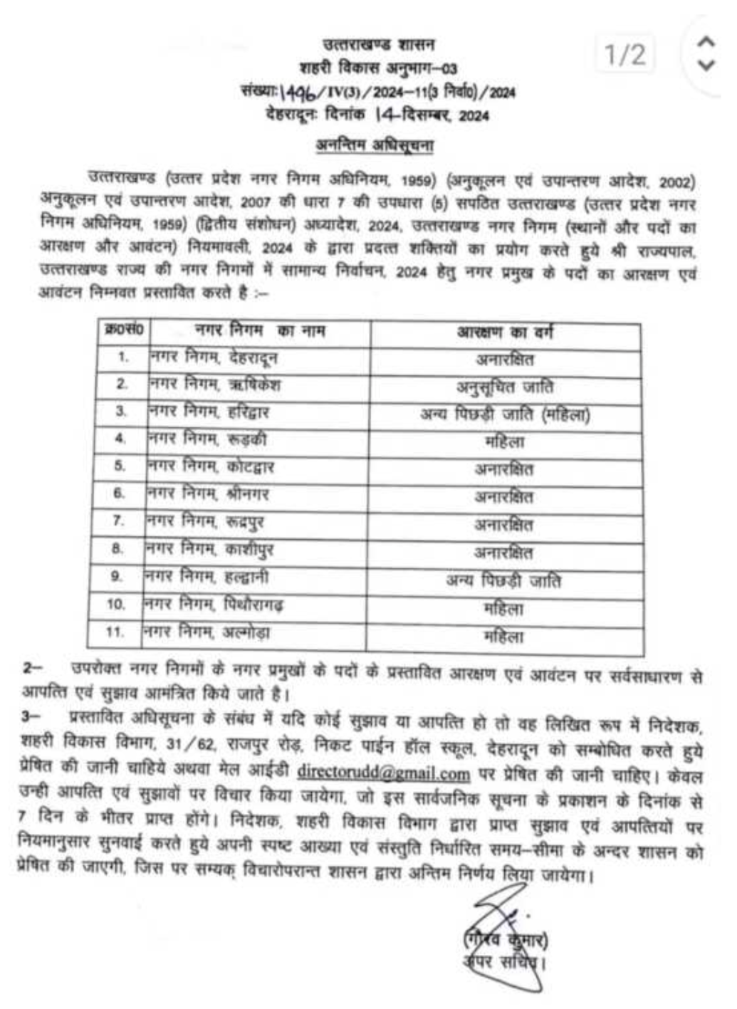 देहरादून। प्रदेश में नगर निकाय चुनाव की तैयारियां तेज हो गई हैं। इसी क्रम में आज उत्तराखंड शासन ने अंतिम अधिसूचना जारी कर दी है जिसमें प्रदेश के 11 नगर निग़म के लिए आरक्षण की स्थिति प्रस्तावित की गई है। इसके तहत नगर निगम देहरादून अनारक्षित, ऋषिकेश अनुसूचित जाति, हरिद्वार अन्य पिछड़ी जाति महिला, नगर निगम रुड़की महिला, कोटद्वार, श्रीनगर और रुद्रपुर अनारक्षित, काशीपुर अनारक्षित, नगर निगम हल्द्वानी अन्य पिछड़ा जाति, पिथौरागढ़ और अल्मोड़ा महिला सीट आरक्षित की गई है।