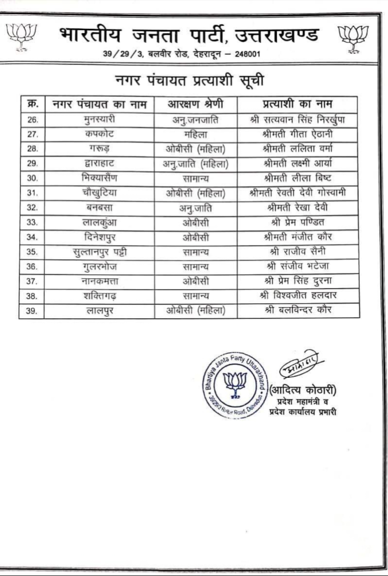 उत्तराखण्ड प्रदेश चुनाव समिति की बैठक प्रदेश अध्यक्ष महेन्द्र भट्ट की अध्यक्षता में दिनांक 26 दिसम्बर 2024 को भाजपा प्रदेश कार्यालय देहरादून में संपन्न हुई। बैठक में मुख्यमंत्री पुष्कर सिंह धामी, राष्ट्रीय महामंत्री व प्रदेश प्रभारी दुष्यंत कुमार गौतम, राष्ट्रीय उपाध्यक्ष व प्रदेश सह-प्रभारी रेखा वर्मा एवं प्रदेश चुनाव समिति के अन्य सदस्यगण उपस्थित रहे। प्रदेश चुनाव समिति ने होने वाले नगर निकाय चुनाव के लिए प्रत्याशियों की सूची जारी कर दी है।