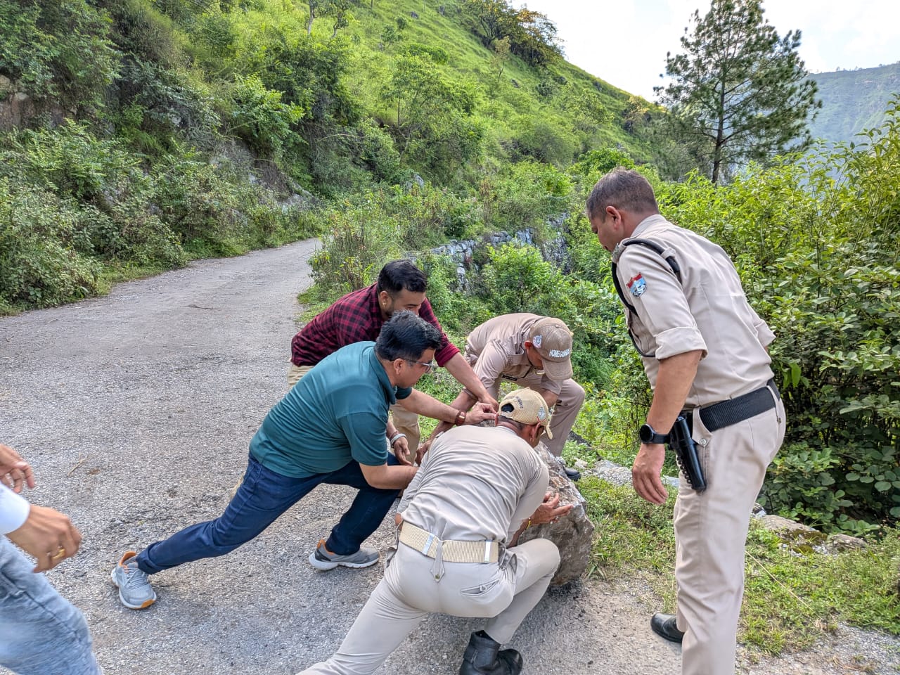 पिथौरागढ़। पंचायत सामान्य निर्वाचन 2025 के तहत पोलिंग बूथों के निरीक्षण के क्रम में आज अपराह्न जिलाधिकारी विनोद गोस्वामी सड़क मार्ग से झूलाघाट क्षेत्र के मतदान केंद्रों का जायजा लेने जा रहे थे। इसी दौरान कटियानी रोड पर भारी पत्थर और बोल्डरों के कारण मार्ग अवरुद्ध हो गया था।